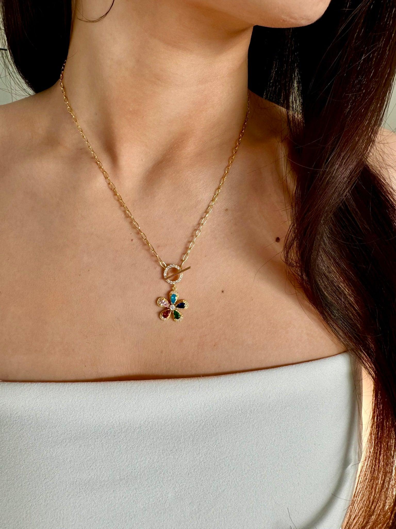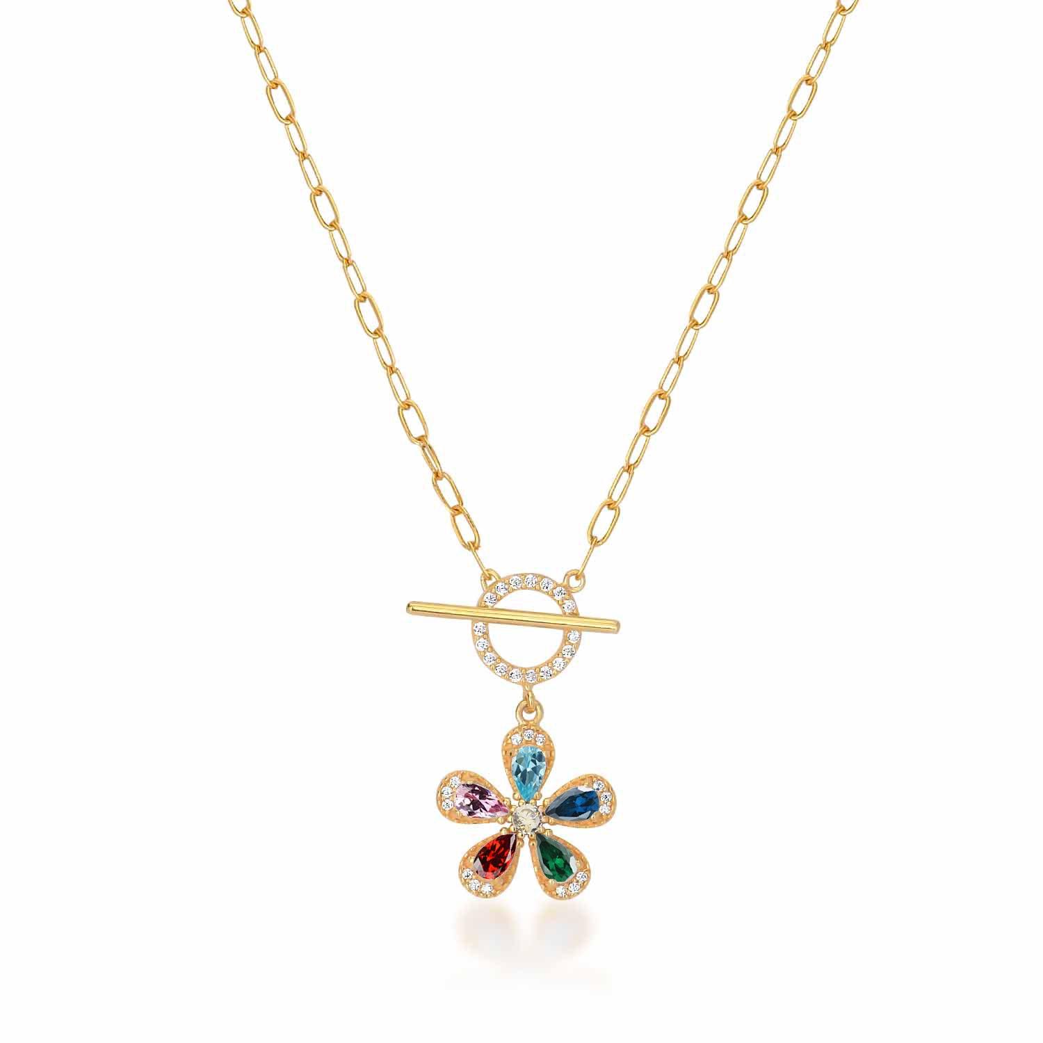 Multi Color Flower Pendant & Chain Necklace In Gold Vermeil